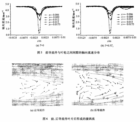 1)前導流件葉片后的尾流影響進入葉輪入口流體速度分布,也是導致合力矩系數Cm**問發(fā)生變化的主要原因,從而影響葉輪的旋轉特性。