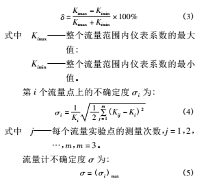 渦輪流量計的原理:當(dāng)被測流體流過傳感器時,在流體作用下,葉輪受力旋轉(zhuǎn),其轉(zhuǎn)速與管道平均流速成正比,葉輪的轉(zhuǎn)動周期改變磁電轉(zhuǎn)換器的磁阻值,檢測線圈中的磁通隨之發(fā)生周期性變化,產(chǎn)生周期性的感應(yīng)電勢,即電脈沖信號?;跍u輪流量計的測量原理,根據(jù)渦輪流量計檢定規(guī)程,確定了實流實驗結(jié)果的評價指標(biāo),其中包括: 儀表系數(shù)、平均儀表系數(shù)相對誤差、線性度和不確定度。