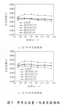 a.在雙彎頭的各工況中,前20D儀表系數(shù)隨流量的增加變化平緩,前10D和前5D有明顯上升趨勢,前2D有明顯下降趨勢,說明前10D、5D、2D的線性度較前20D的差。
