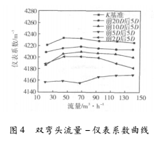 圖4為雙彎頭流量-儀表系數(shù)曲線。