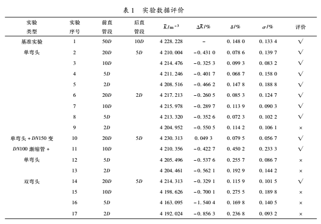 c.在后2D的數(shù)據(jù)中,前2D的結(jié)果不滿足評價準(zhǔn)則,所以對單彎頭而言,后直管段長度為5D情況下前直管段長度至少為2D,后直管段長度為2D情況下前直管段長度至少為5D。